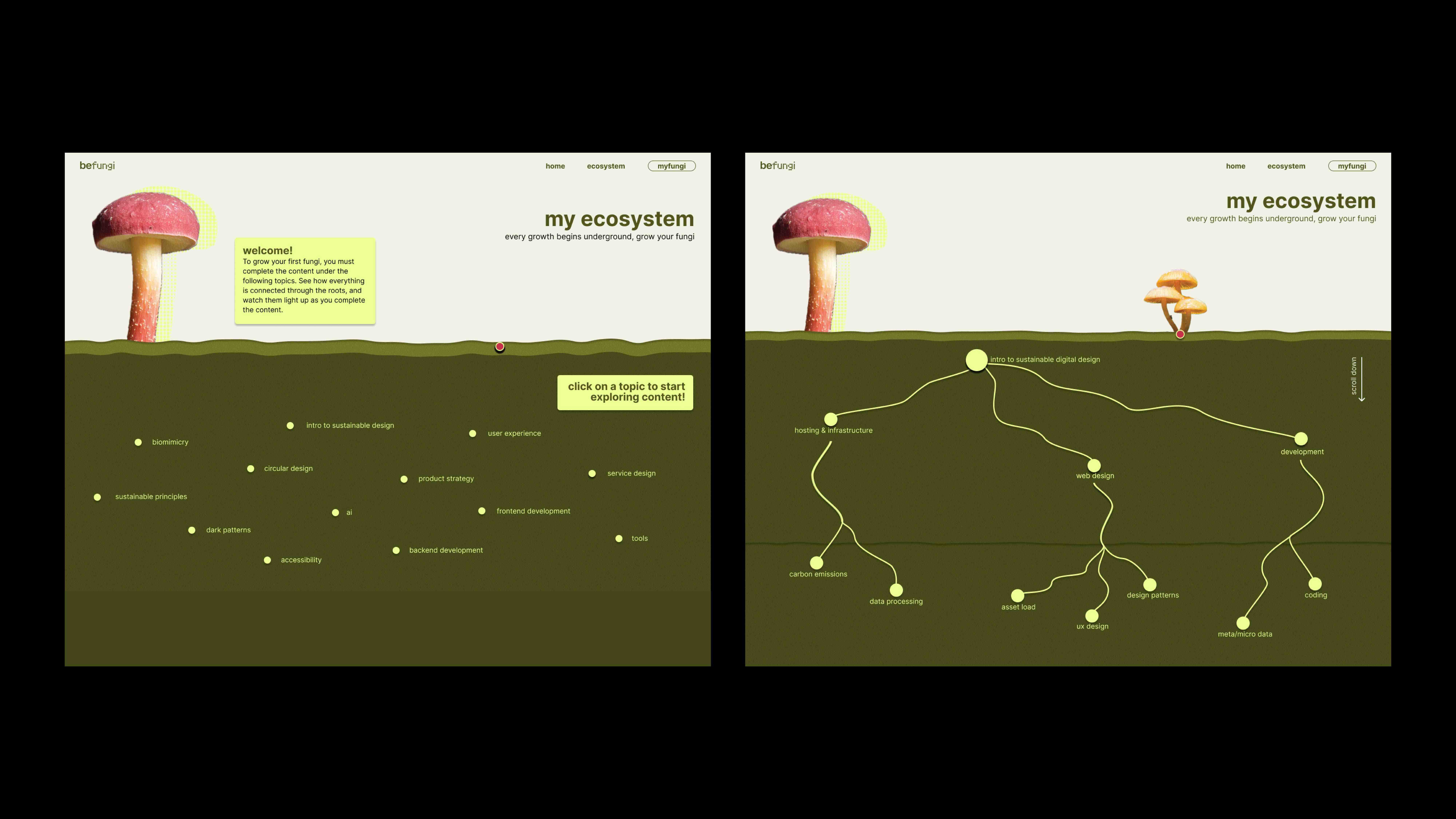Befungi is an educational platform that has introduced a new way of discovering and visualizing educational content through its fungi-inspired growth system. Future developments will focus on accessibility by adding a conventional content discovery mode alongside the gamified version to encourage long-term engagement. Ultimately, we hope to build a more collaborative space where designers can share sustainable design tips and evolve together for a greener digital future.