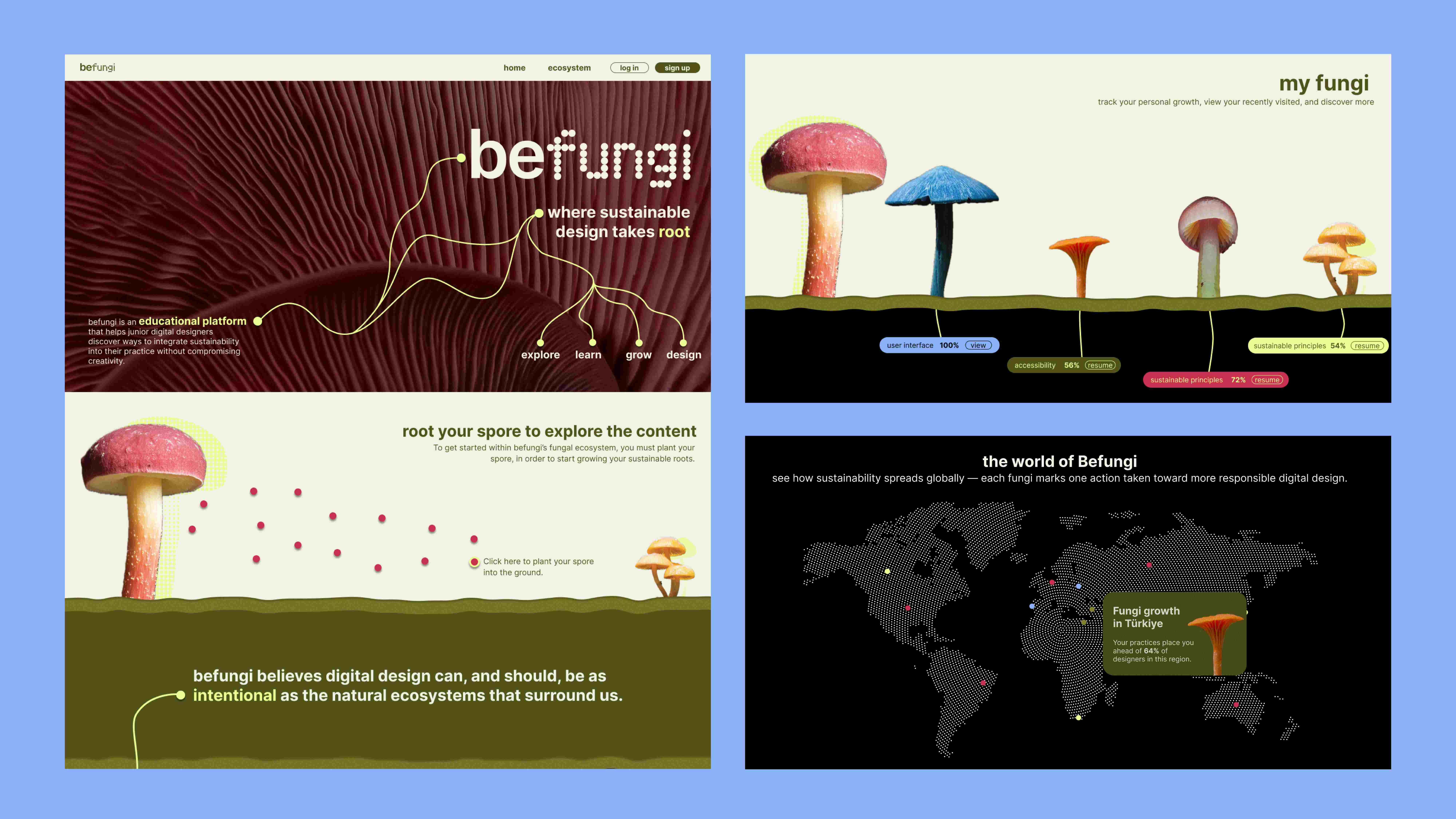 Befungi is a gamified educational platform designed to help junior digital designers integrate sustainability into their practice without compromising their creative freedom. The platform facilitates digital ecoliteracy through curated, engaging content. It teaches designers to apply sustainable practices by first helping them understand their digital impact.