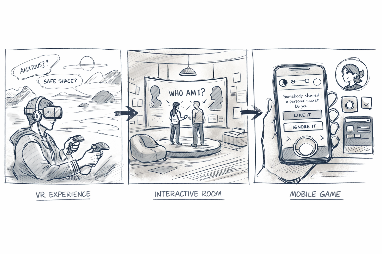 Early in the process, Eos explored multiple formats, including a VR experience and a physical installation. While these concepts offered strong emotional impact, they quickly revealed limitations. VR raised accessibility concerns, and physical spaces lacked scalability and classroom integration. A game-based experience, however, allowed for repetition, pattern- building, and individual pacing. It also aligned with how teenagers already interact with digital systems.