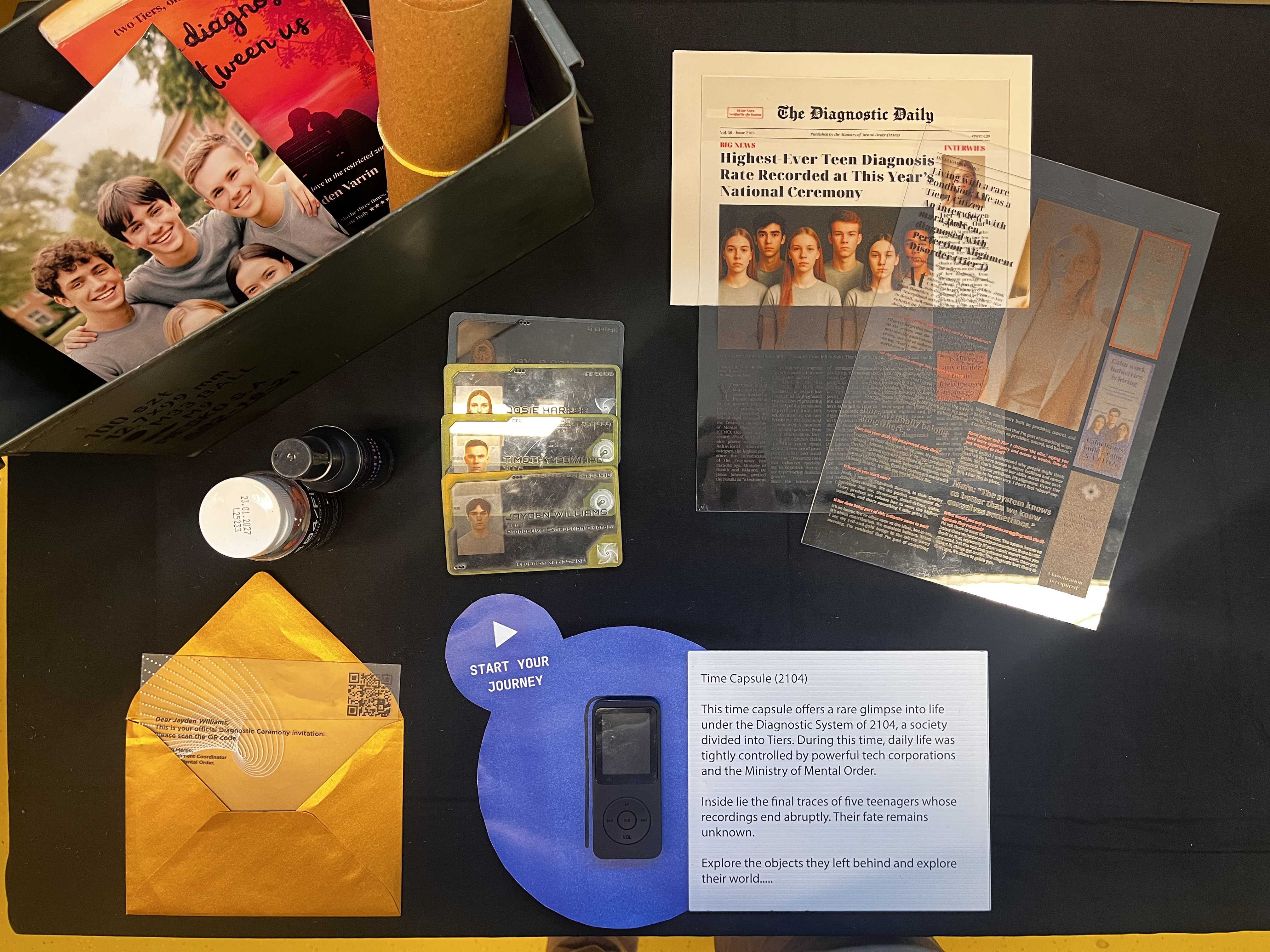 - Time Capsule: A collection of physical artifacts (diegetic prototypes) such as illegal pills, friendship contracts, IDs and many more.