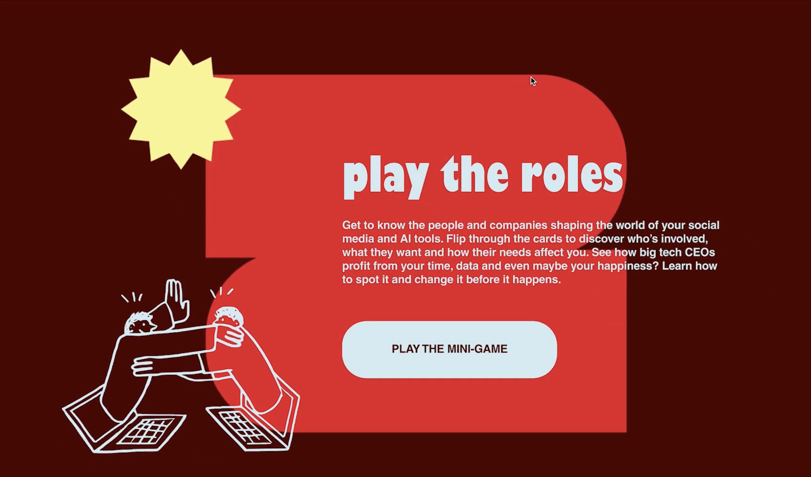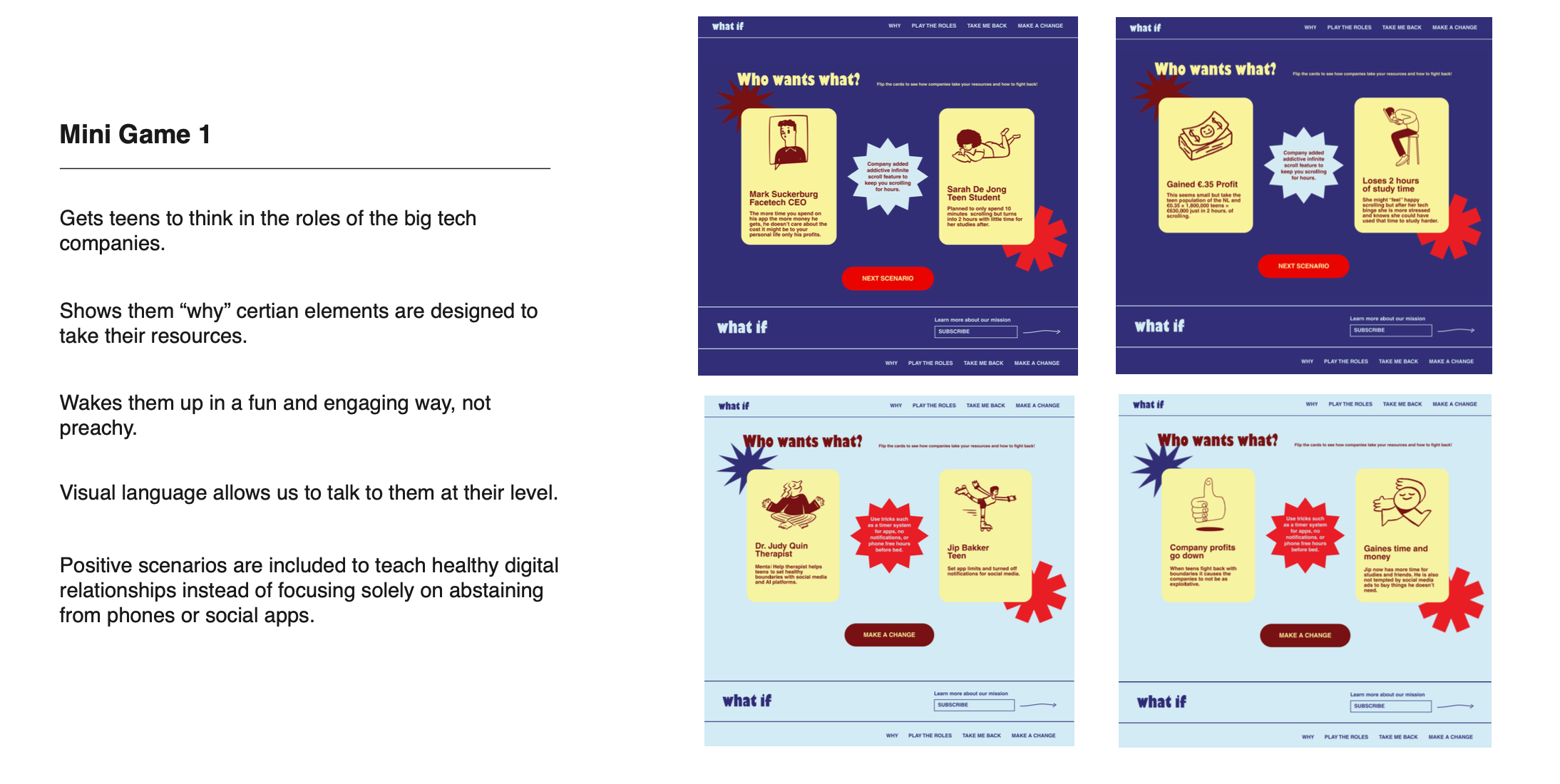 The first mini-game places users in the role of tech company decision-makers, displaying how profit-driven goals conflict with user well-being. Through simple card-based interactions, players see how design decisions (such as endless scrolling or engagement optimization) benefit companies while extracting time, attention, and emotional resources from teen users. This role reversal encourages perspective-taking and helps teens understand that harmful outcomes are often the result of intentional design choices rather than individual failure.