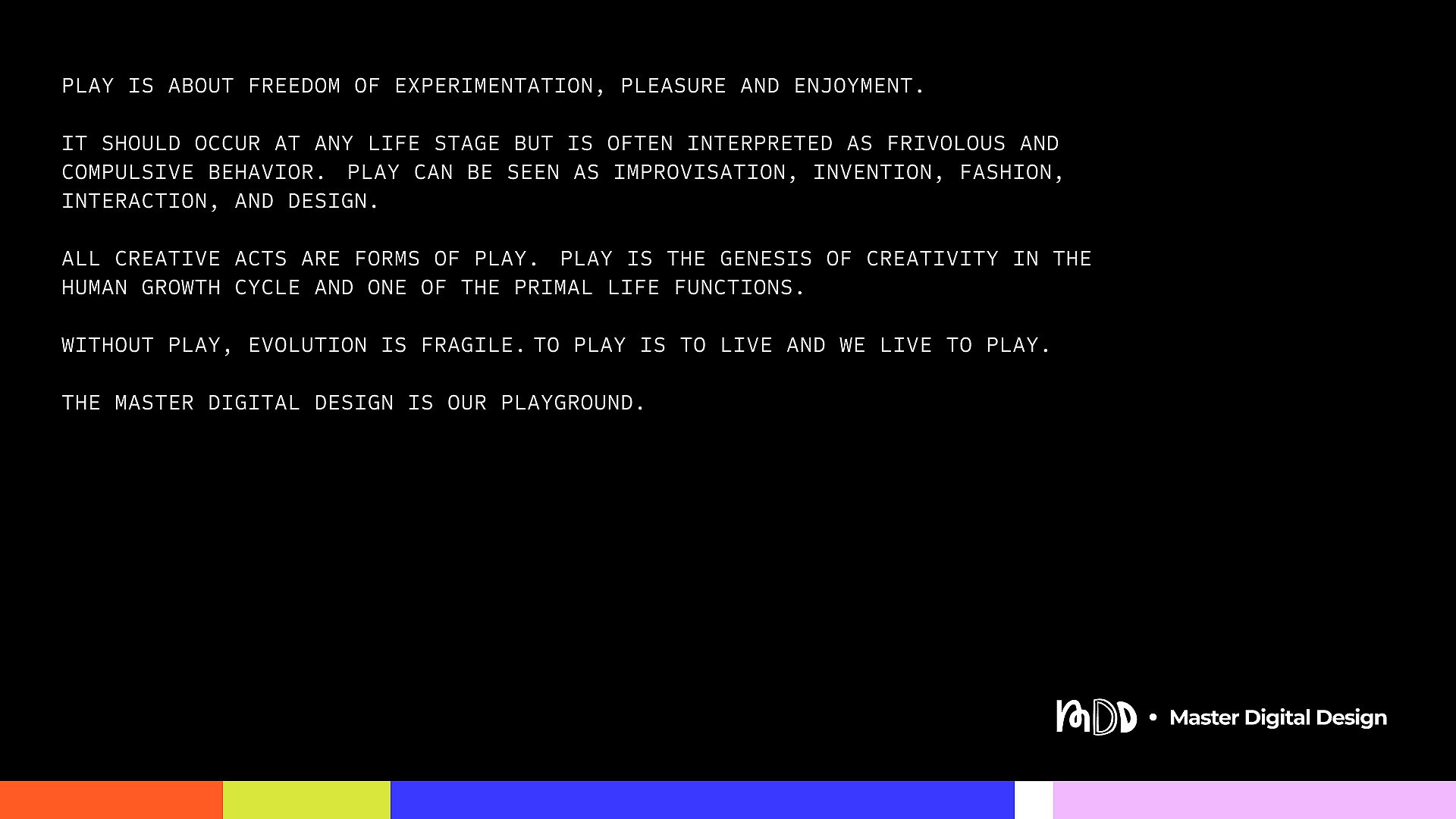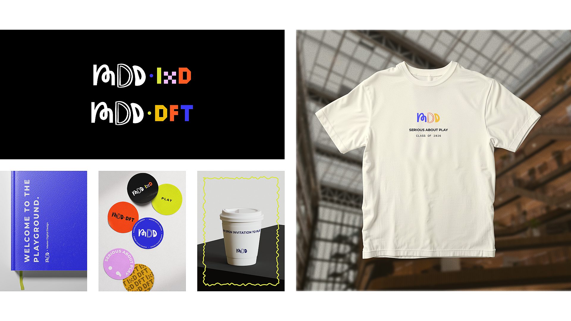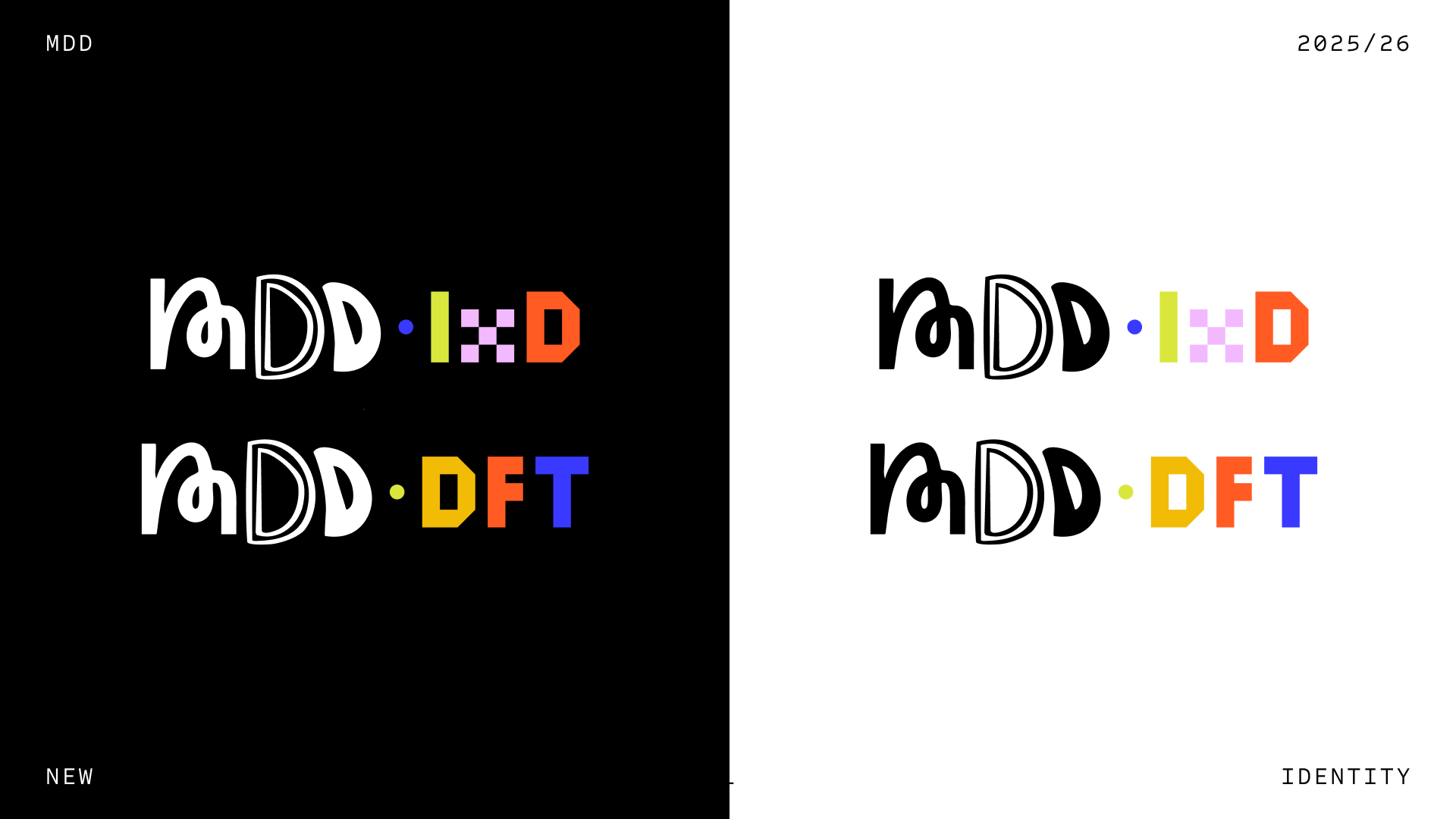 When we were asked to create the new visual identity for the Master Digital Design (MDD), we didn’t want to just design a logo. Our goal was to design a feeling, the one of arriving in a space where play, experimentation, and multidisciplinary chaos coexist in the best possible way.